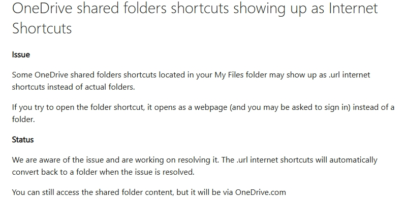 Пользователи на обеих платформах сообщили, что общие папки больше не отображаются в локальных каталогах OneDrive и вместо них появились файлы .url, указывающие на веб-интерфейс сервиса. Тогда Microsoft подтвердила наличие проблемы и заявила, что проводит её расследование.
