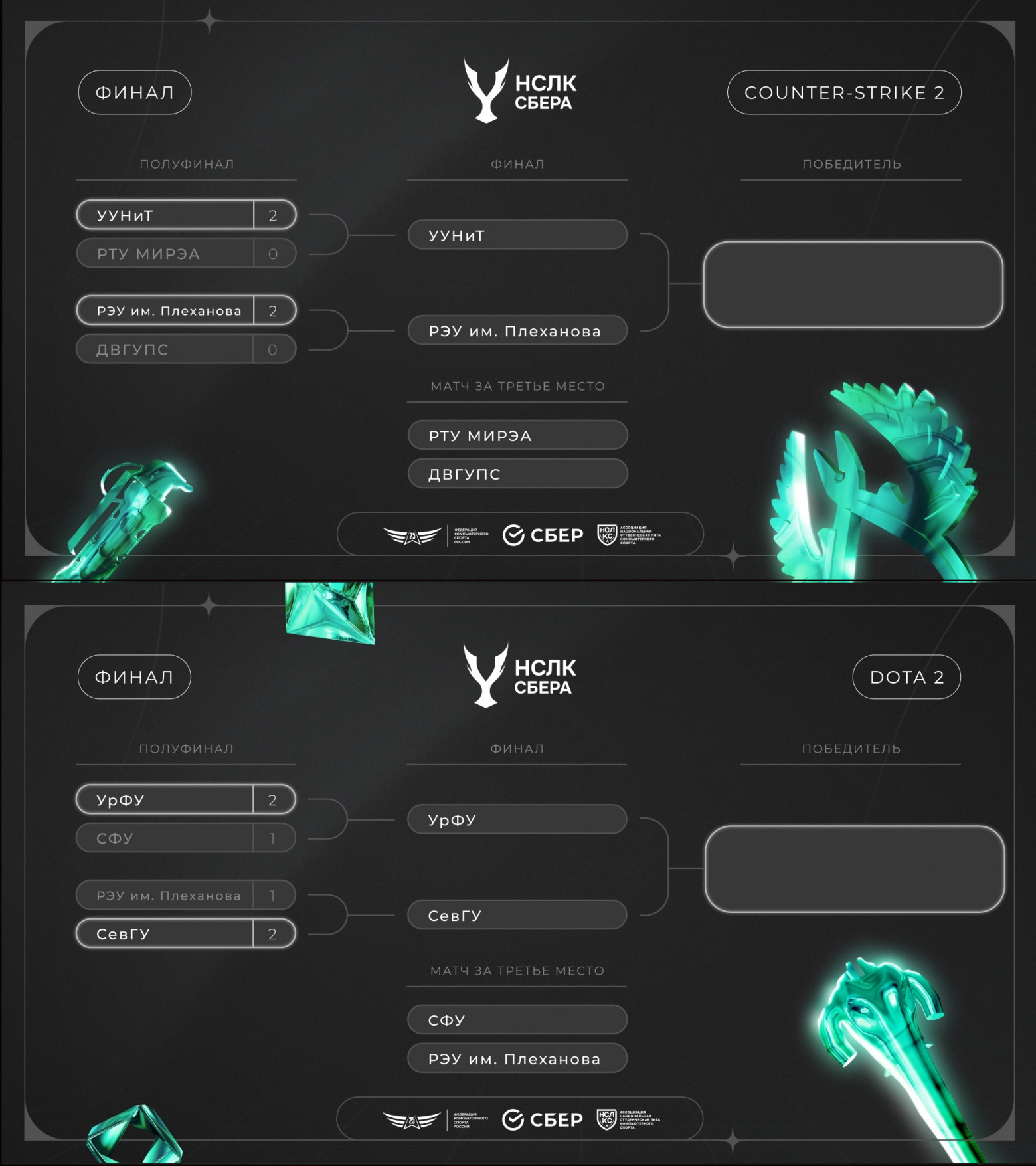 In the semifinals, UrFU (Yekaterinburg) defeated SFEDU (Krasnoyarsk) with a score of 2:1, while SevGU (Sevastopol) won against PRUE (Moscow) also 2:1. In the match for third place, SFEDU proved to be stronger than PRUE, taking the victory 2:0.