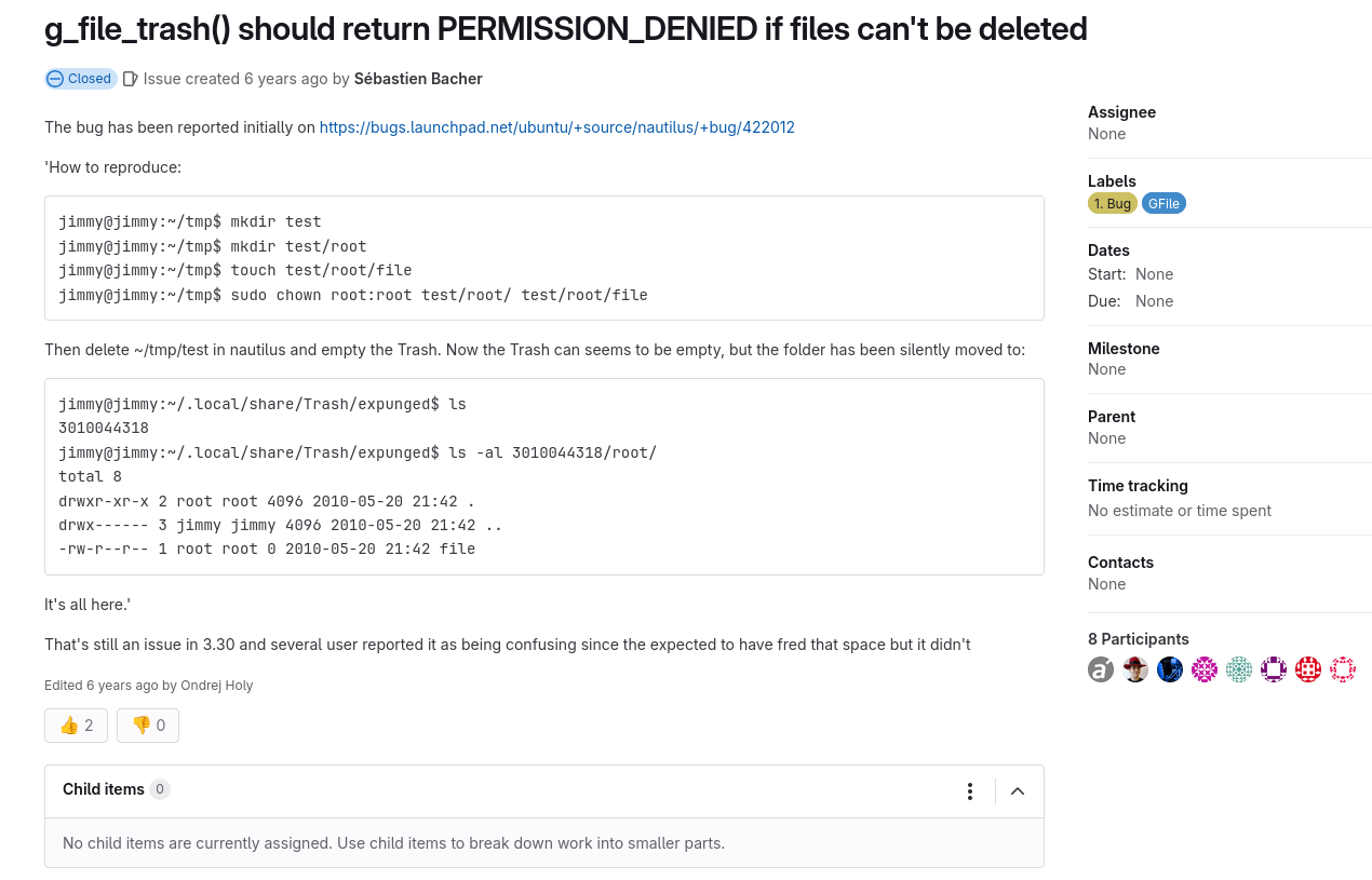 The bug report indicated that the function `g_file_trash()` was supposed to return `PERMISSION_DENIED` if files could not be deleted. This flaw meant that not all files and directories were being properly removed when emptying the «Trash» on the GNOME desktop.